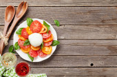 Zdjęcie "Sałatka z serem burrata i pomidorami z miejsca powyżej" może być wykorzystywane do celów osobistych i komercyjnych zgodnie z warunkami zakupionej licencji Royalty-free. Obraz jest dostępny do pobrania w jakości wysokiej rozdzielczości do 5760x3840.