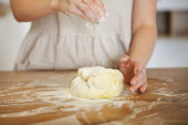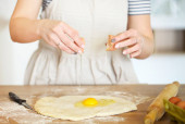 Nierozpoznana gospodyni domowa rozbijająca jajko o surowe ciasto podczas gotowania przy stole w kuchni