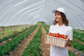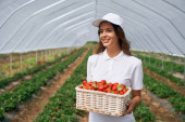 Kobieta ogrodnik gospodarstwa wiklinowy kosz z truskawkami