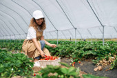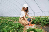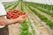 Kobieta w masce medycznej gospodarstwa koszyk z truskawkami