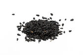 kilka nasion Nigella sativa (kminek czarny) zbliżyć na szarej płycie ceramicznej
