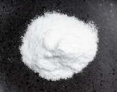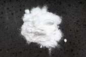 widok górny stosu substytutu cukru - krystaliczny ekstrakt z roślin stewii z bliska na czarnej płycie ceramicznej