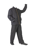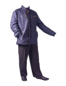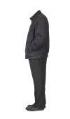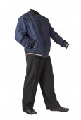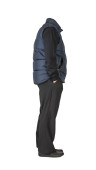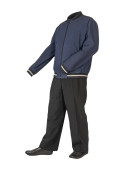 ciemnoniebieska marynarka bombowca, czarne spodnie i czarne skórzane buty odizolowane na białym tle. męskie jesienne ubrania