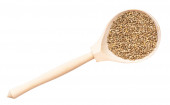 drewniana łyżka z niegotowaną kaszą pszenną (rozdrobnione ziarna pszenicy częściowo łuszczone) izolowana na białym tle