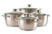 Ladle i dwie patelnie ze stali nierdzewnej z pokrywą szklaną. Izolacja na białym tle.