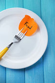 papier firmowy z wiadomości dołączone do stołu, na talerzu, drewniane tła kolor