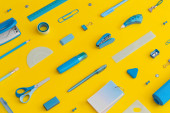 Zdjęcie "Niebieska szkolna papeteria na szarym tle. Widok góry. Leżeć płasko. Powrót do koncepcji szkoły." może być wykorzystywane do celów osobistych i komercyjnych zgodnie z warunkami zakupionej licencji Royalty-free. Obraz jest dostępny do pobrania w jakości wysokiej rozdzielczości do 5760x3840.