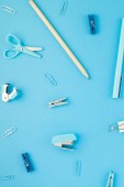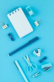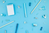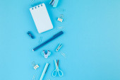 Niebieska szkolna papeteria na szarym tle. Widok góry. Leżeć płasko. Powrót do koncepcji szkoły.