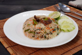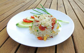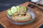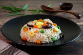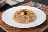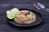 Zdjęcie "Wegetariańskie jedzenie: Kantoński smażony ryż z tofu, marchew i zielone warzywa. Wegetariański festiwal. Skupienie selektywne." może być wykorzystywane do celów osobistych i komercyjnych zgodnie z warunkami zakupionej licencji Royalty-free. Obraz jest dostępny do pobrania w jakości wysokiej rozdzielczości do 5760x3840.