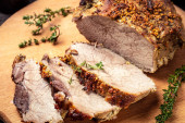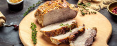 pieczona wieprzowina z musztardą na desce do krojenia. baner, przepis menu.