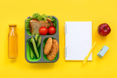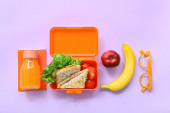 Zdjęcie "Lunch box z smacznym jedzeniem na tle koloru" może być wykorzystywane do celów osobistych i komercyjnych zgodnie z warunkami zakupionej licencji Royalty-free. Obraz jest dostępny do pobrania w jakości wysokiej rozdzielczości do 5760x3840.