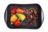 Trzy miski z gotowanej wołowiny, plasterki kurczaka i krewetki izolowane na białym