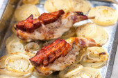 królicze nóżki pieczone z bekonem na krążkach cebulowych