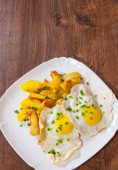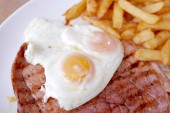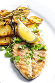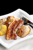 mięso pieczone z brzoskwinią i serem serwowane z frytkami