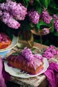 Lawendowe ciasto glazury na stole w wiosennym ogrodzie.. vintage.selective ostrości