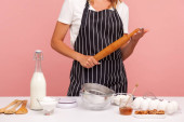Przycięty wizerunek piekarza w czarnym fartuchu w paski mieszający ciasto z corolla, pieczenie piekarni, domowe ciasto, cukiernik przygotowujący ciasto. Kryty studio strzał izolowany na różowym tle.