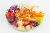 Stek i sałatka na białym tle. Nowa normalna od dostawy do domu w stylu żywności pakowania przez tacę z tworzywa sztucznego lub pianki. Keto jedzenie dla zdrowia. zbliżenie fotografii odosobnionego tła.