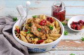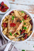 Makaron z kurczaka i suszonych pomidorów.. styl tugge.selective focus