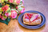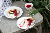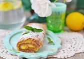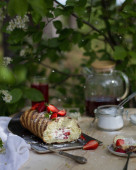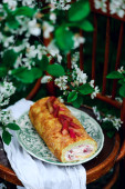 Vanilla rabarbar szwajcarski rolka na stole zestaw w ogrodzie kwitnącej wiosny.. vintage style.selective ostrość