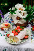 Zdjęcie "Vanilla rabarbar szwajcarski rolka na stole zestaw w ogrodzie kwitnącej wiosny.. vintage style.selective ostrość" może być wykorzystywane do celów osobistych i komercyjnych zgodnie z warunkami zakupionej licencji Royalty-free. Obraz jest dostępny do pobrania w jakości wysokiej rozdzielczości do 5760x3840.