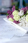 Kompozycja z kubki do herbaty i piękne wiosenne kwiaty w wazonie, na drewnianym stole, na jasnym tle