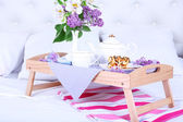 Drewniana taca z lekkim śniadaniem na łóżku