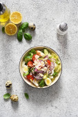 Caprese włoskiej lub śródziemnomorskiej lub greckiej sałatki. Pomidor, peynir, liście bazylii i oliwa z oliwek na drewnianym stole.