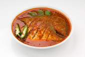Zdjęcie "Seer Fish curry, tradycyjne indyjskie curry rybne, ułożone w białej ceramicznej misce ozdobionej liśćmi curry, szalotkami i świeżym chłodem na szarym, teksturowanym tle, izolowane." może być wykorzystywane do celów osobistych i komercyjnych zgodnie z warunkami zakupionej licencji Royalty-free. Obraz jest dostępny do pobrania w jakości wysokiej rozdzielczości do 5760x3840.