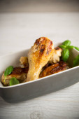 kawałki pieczonego filetu z kurczaka z przyprawami i ziołami, w formie ceramicznej na drewnianym stole