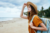 Kobieta w t-shirtach stoi na piaszczystym brzegu plaży w pobliżu morza