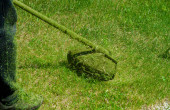 Letnia praca w parku. Ogrodnik kosi trawę. Mężczyzna używa przycinarki do trawników bez osłony ochronnej.