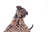 izolowane cztery wyhodowane szczenięta w kartonowym pudełku na białym tle