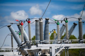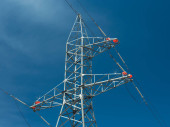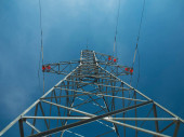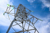 Elektryk w pomarańczowym hełmie wspina się na wieżę wysokiego napięcia przeciwko błękitnemu niebu.