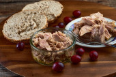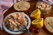 Miska z serem wiejskim i kromkami chleba na drewnianej desce
