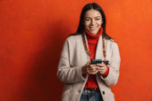 Portret uśmiechniętej, atrakcyjnej, swobodnej kobiety korzystającej ze smartfona na odizolowanym tle, piszącej smsy