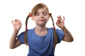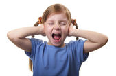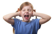 dziewczynka z oba uszy zamknięte przez ręce na białym tle nad białym