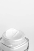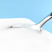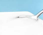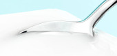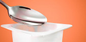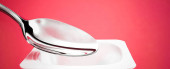 Kubek jogurtowy i srebrna łyżka na niebieskim tle, biały plastikowy pojemnik, świeży nabiał dla zdrowej diety i odżywiania