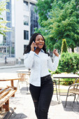 wesoły Afroamerykanin plus rozmiar kobieta trzyma kawę iść i rozmawiać na smartfonie na zewnątrz, baner