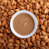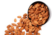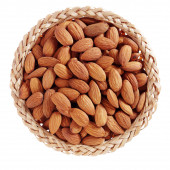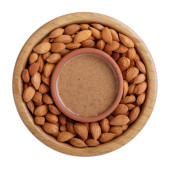 Jądro moreli w drewnianej misce izolowane na białym tle. Widok z góry.