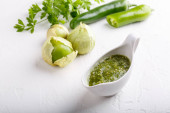 Zdjęcie "Tomatillo salsa verde. Miska pikantnego zielonego sosu na białym stole, kuchnia meksykańska." może być wykorzystywane do celów osobistych i komercyjnych zgodnie z warunkami zakupionej licencji Royalty-free. Obraz jest dostępny do pobrania w jakości wysokiej rozdzielczości do 5760x3840.