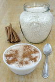 Tradycyjne czerwcowe party brazylijski deser z ryżu i mleka skondensowanego o nazwie arroz doce ozdobione cynamonem na ciemnym tle