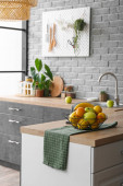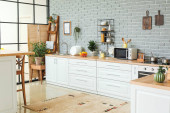 Przybory kuchenne i produkty na stole we wnętrzu nowoczesnej kuchni