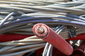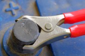 Mechanik zaczyna ciąć żelazną płytę piłą mechaniczną, wybiórczo skupiając się na tarczy. Stolarka metalowa, osoba nierozpoznawalna.