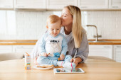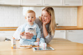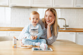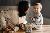 Młoda matka bawi się ze swoim synkiem w domu w łóżku