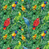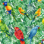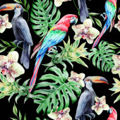 Dzikie ptaki tropikalne papugi i palmy. Ilustracja akwarela, Płynny wzór