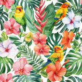 Zdjęcie "Dzikie ptaki tropikalne papugi i palmy. Ilustracja akwarela, Płynny wzór" może być wykorzystywane do celów osobistych i komercyjnych zgodnie z warunkami zakupionej licencji Royalty-free. Obraz jest dostępny do pobrania w jakości wysokiej rozdzielczości do 5760x3840.