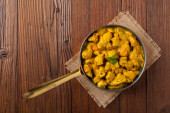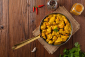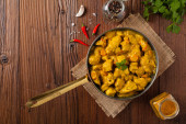 Kurczak w sosie curry. Służył na patelni. Widok góry. Naturalne drewniane tło.