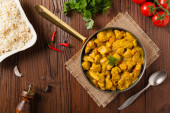 Zdjęcie "Kurczak w sosie curry. Służył na patelni. Widok góry. Naturalne drewniane tło." może być wykorzystywane do celów osobistych i komercyjnych zgodnie z warunkami zakupionej licencji Royalty-free. Obraz jest dostępny do pobrania w jakości wysokiej rozdzielczości do 5760x3840.