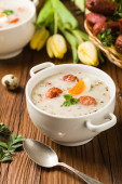 Tradycyjna zupa grzybowa, zrobiona z grzybów wieprzowych. Świąteczne dekoracje. Widok z przodu.