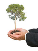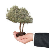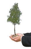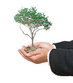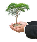 dłonie z growng drzewo ze stosu monet